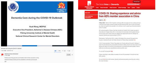 老年人是此次新冠肺炎疫情的高危人群,认知障碍患者还可能由于认知损伤造成疫情防控能力下降,进一步增加疾病感染风险;此外,疫情防控措施的执行还可能造成患者病情的波动,增加照护者的负担和压力。为了更积极地指导疫情期间为认知障碍患者和照护者提供精神卫生和心理社会支持,国际阿尔茨海默病协会(Alzheimer's Disease International, ADI)特别邀请王华丽教授进行全英文专题报告。相关视频已由ADI官方账号上传至YouTube网站(网址:https://www.youtube.com/watch?v=zM6cd1QSSFo&feature=youtu.be)