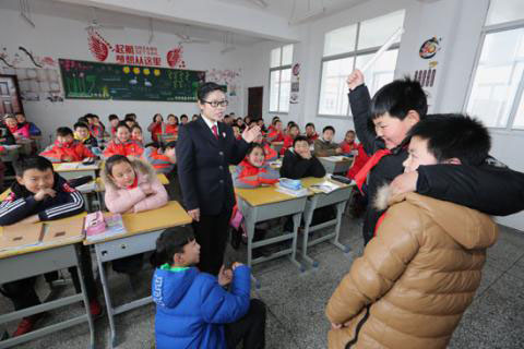 2017年2月22日,在新学期开学之际,湖北省宜城市人民检察院未成年人检察办案组检察官走进宜城市南街小学,通过和学生现场互动、情景剧演示、面对面讲解等方式,教孩子们如何正确应对校园欺凌和校园暴力。(资料图片)视觉中国供图