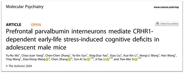 近日,我院司天梅教授团队在Molecular Psychiatry上发表了题为“Prefrontal parvalbumin interneurons mediate CRHR1-dependent early-life stress-induced cognitive deficits in adolescent male mice”的研究论文。该研究首次揭示了前额叶PV中间神经元在早期应激诱导的青春期雄性小鼠认知损害中的重要参与作用,为深入理解早年应激相关神经精神疾病的发病机制及开发早期干预策略提供了新的方向。