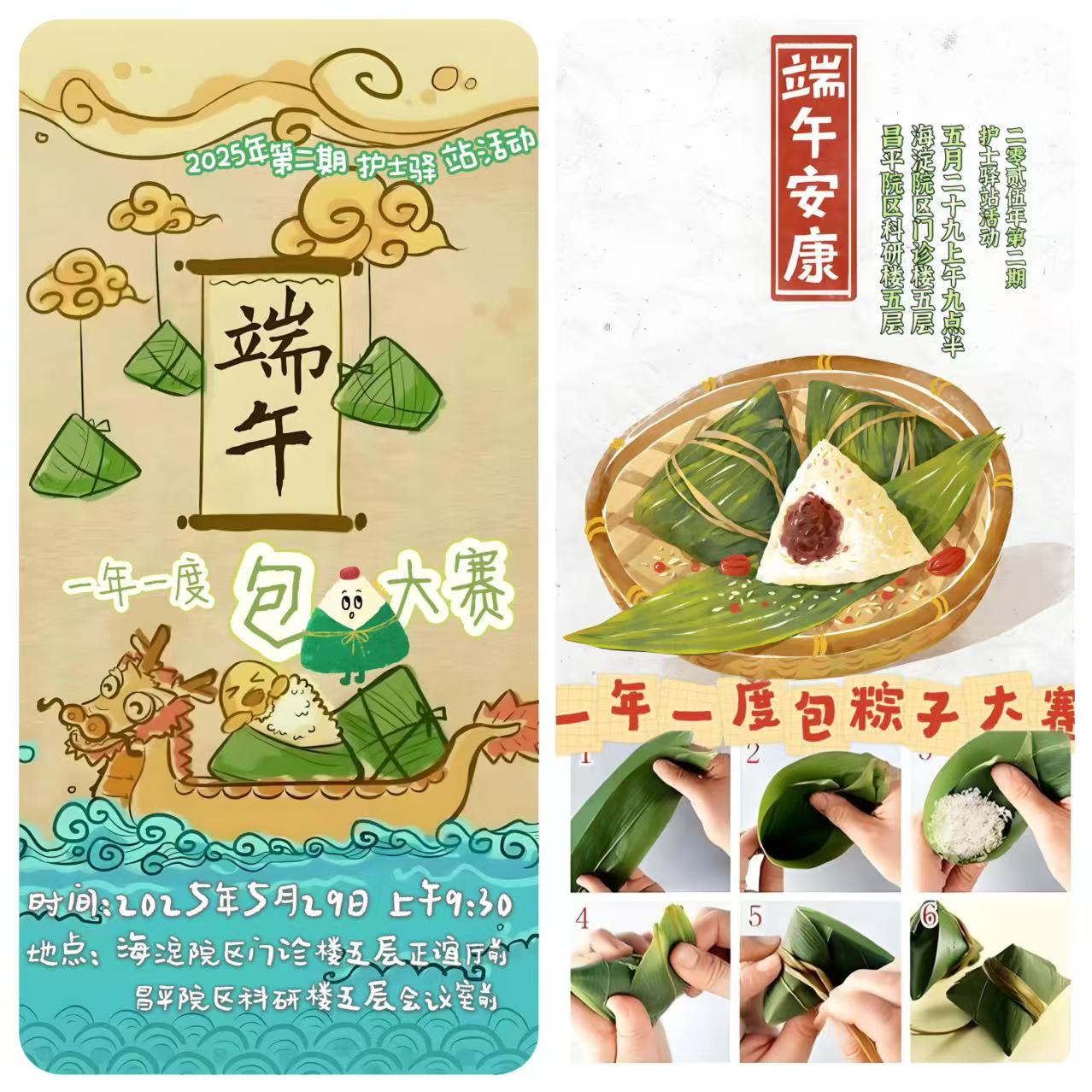 端午近,粽香飘。为传承和弘扬中华民族传统文化,营造温馨节日氛围,传递医院对护理人员的深切关怀,2025年5月29日188金宝搏吧 护理部联合工会,在昌平院区科研楼5层会议室前和海淀院区门诊楼5层正谊厅前组织了2025年第二期护士驿站活动——包粽子大赛。