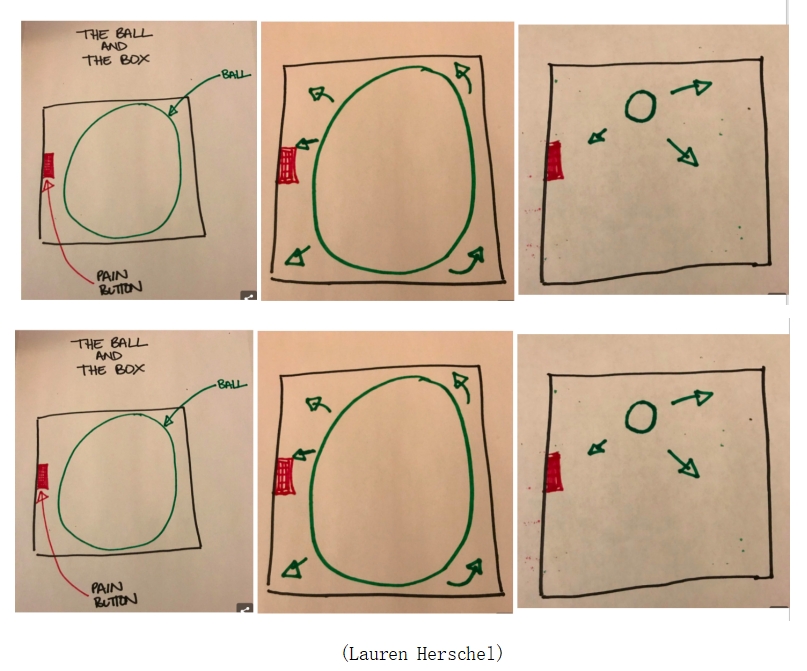 我想和你分享一段其他人是如何描述哀伤的过程:“哀痛就像是一个装了球的盒子, 然后, 里面还有一个疼痛按钮。在一开始, 这个球很大,当你移动盒子的时候, 球会一直撞击疼痛按钮。它就在盒子里滚来滚去, 一次又一次的进行着撞击。你没有办法控制它,于是你的心真的好疼啊,有的时候疼起来没完没了。随着时间的推移,球会慢慢变小,它撞击到疼痛按钮的次数也越来越少了,但是每一次撞击,疼痛的感觉还是一样,情况变得好一些了 , 因为你可以正常的过日子了,但也有不好的地方, 就是这个球啊,总是在你最不经意的时候,狠狠撞击了按钮。”